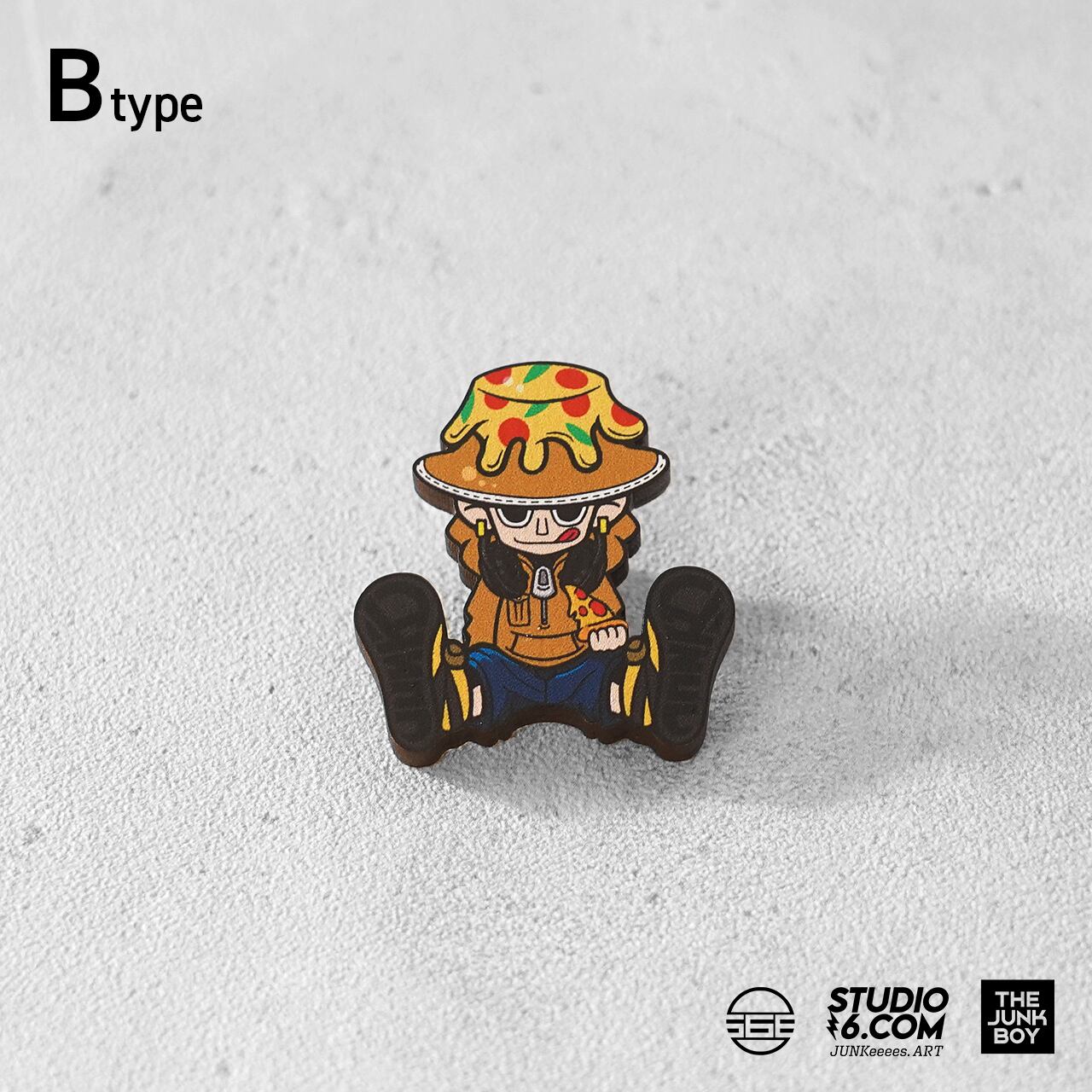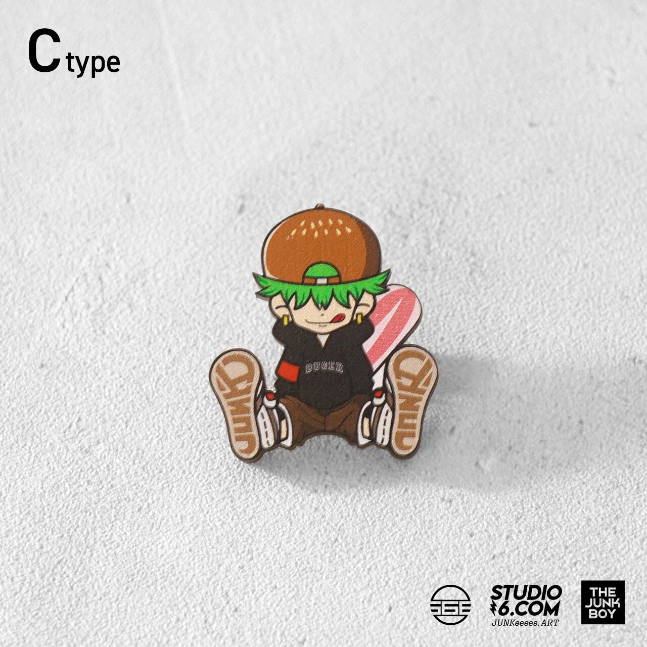JUNKeeeeSの人気キャラクターたちが、木の温もりを感じる“ウッド調ピンバッジ”になって登場。
